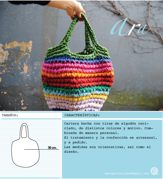 ACA LES PRESENTO A LAS CARTERAS QUE COMBINA TIRAS DE ALGODON RECICLADO CON HILO DE DISTINTOS COLORES.
